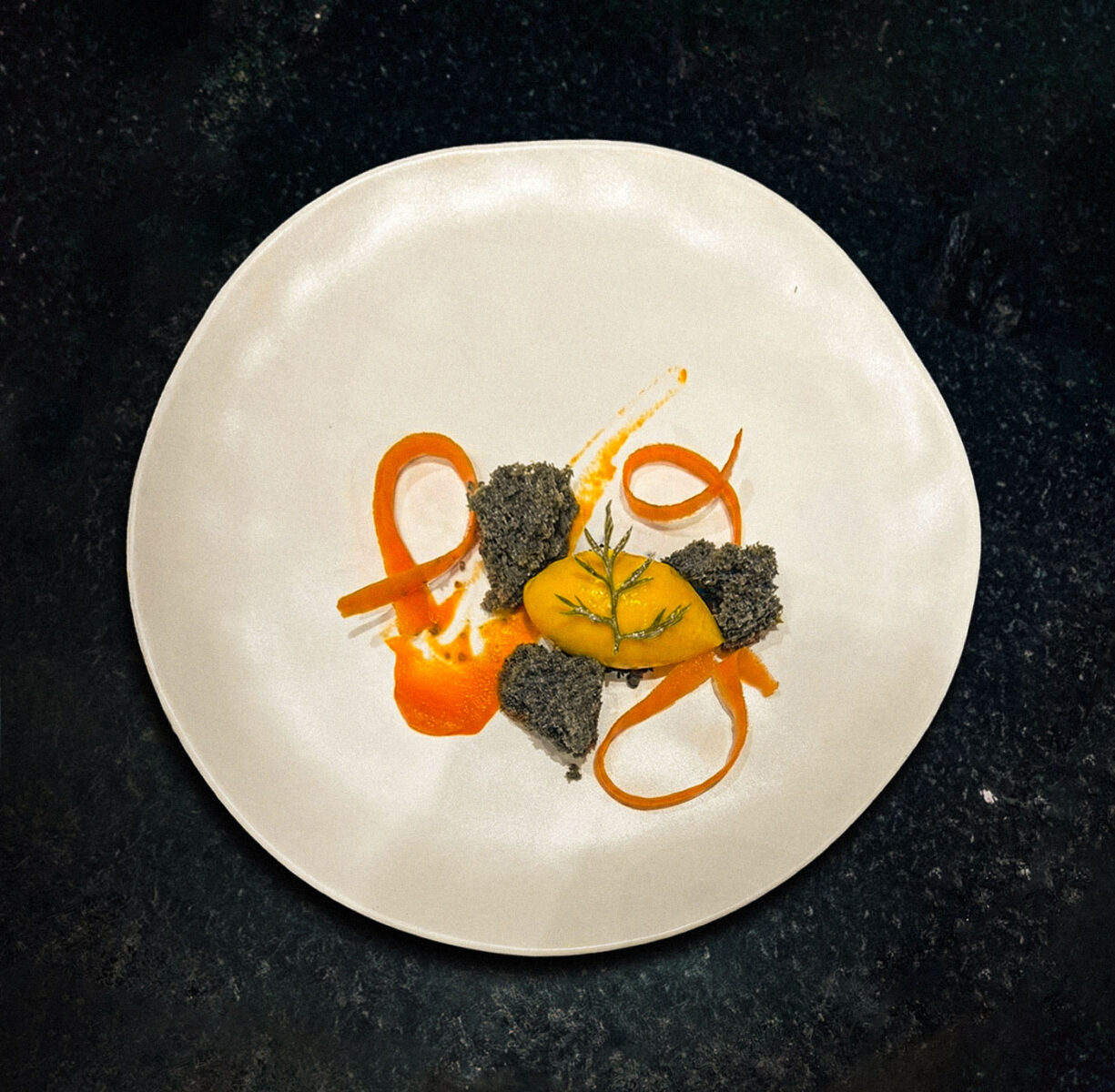 1. Monte o bolo como preferir: da maneira mais tradicional, com o purê de cenoura como recheio e a ganache como cobertura, além dos picles e da rama em cima e ao lado, decorando, ou da maneira desconstruída proposta pelo chef.