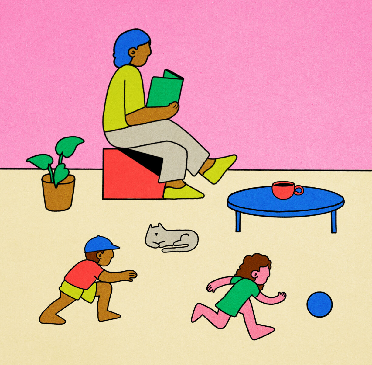 Descansar tendo filhos em casa nem sempre é se afastar deles, se trancar no quarto e dormir — às vezes, porém, isso é essencial e você pode fazer sem culpa. Mas, em muitos casos, é possível integrá-los ao momento de relaxamento. Carol Rocha conta que aprendeu a descansar com Valentin o convidando para as atividades que a relaxam, como fazer um escalda-pés e skincare. “É o nosso ‘spazinho’. A gente coloca máscara facial juntos, se vou fazer algo nas minhas unhas, lixo as dele, fazemos massagem um nos pés do outro. Com essas coisas, ele aprendeu sobre cuidado, por exemplo.” Priscilla Montes reforça que apresentar esses momentos também educa. “A criança só vai aprender a se cuidar se ela tem cuidadores que se cuidam também, que olham para si”, diz. Isso pode ser um “banho premium”, como Carol brinca com o filho, um passeio em livrarias e museus, uma leitura lado a lado, assistir a um filme que você adorava na infância ou se deitar com as pernas para cima enquanto a criança brinca por perto.